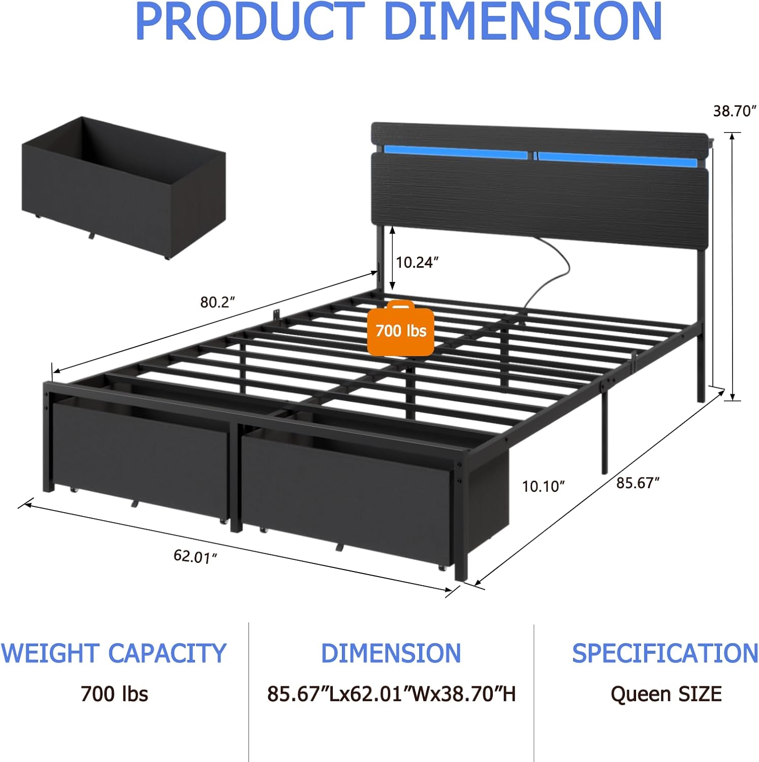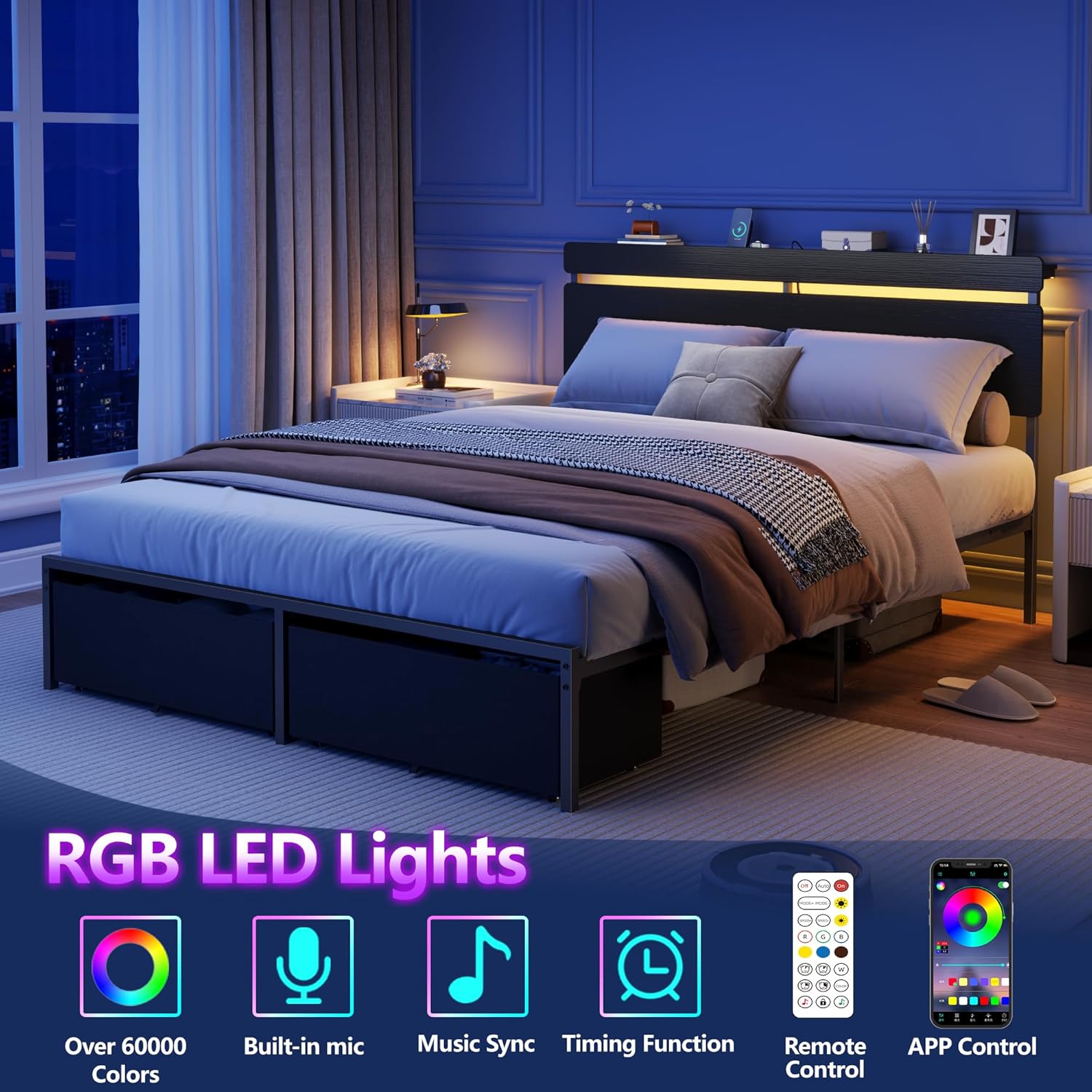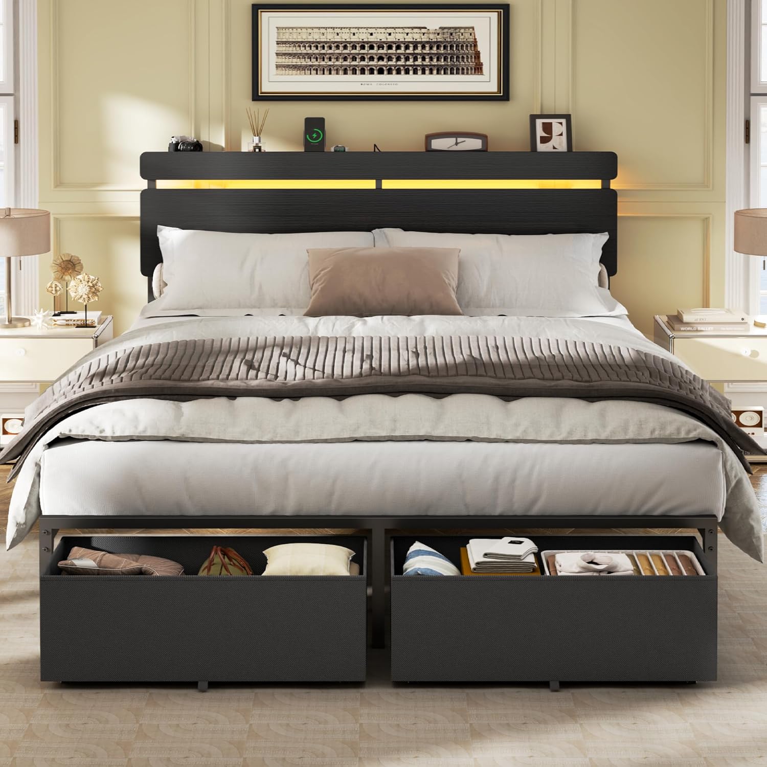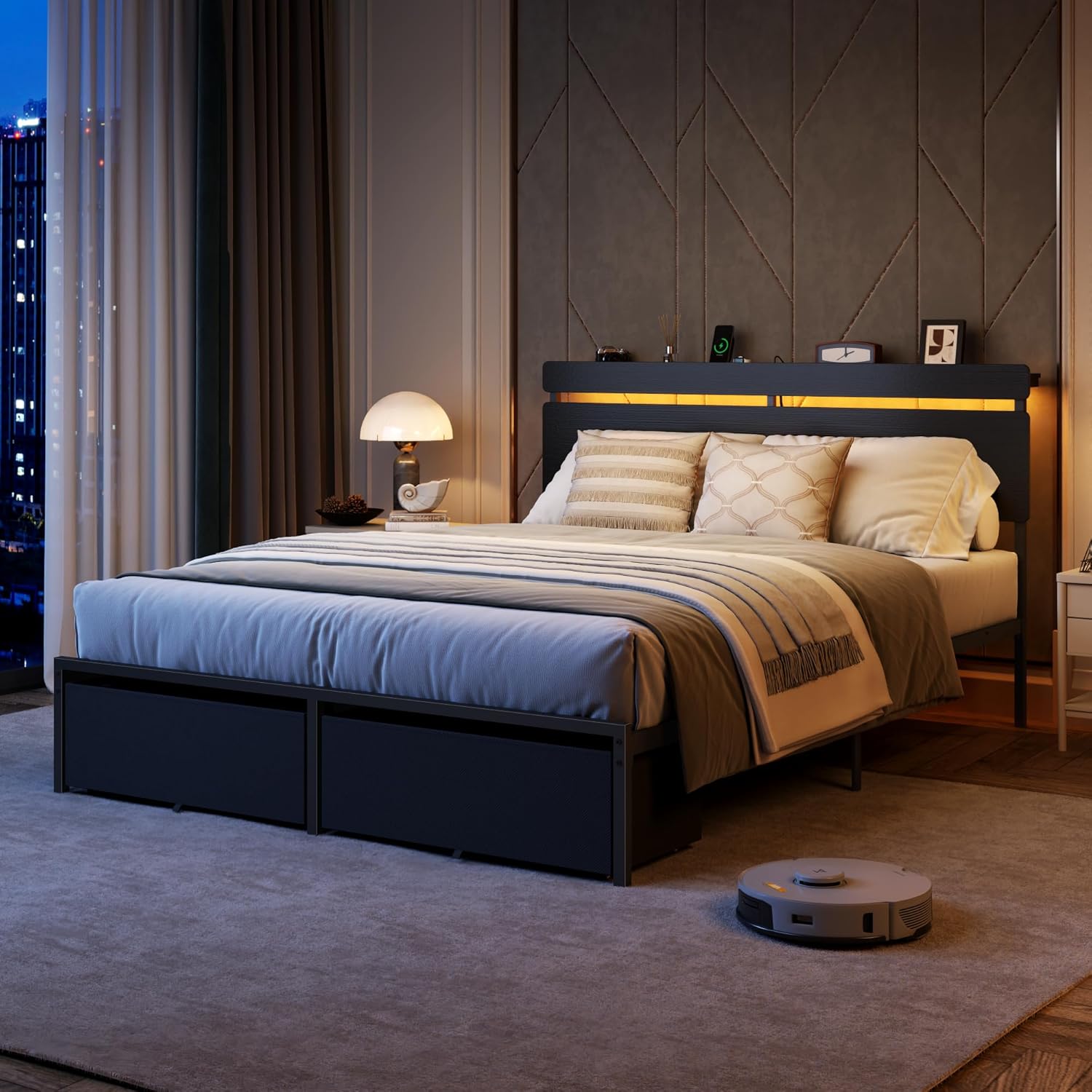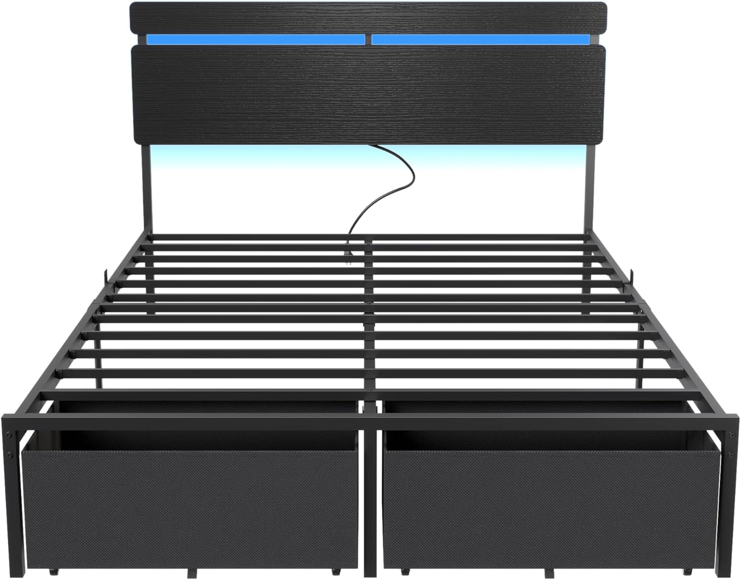 Forestell Queen Bed Frame with Wood Headboard, Black Platform Bed with 2 Storage Drawers & Shelf, Built-in Charging Station & LED Lights, Metal Support, No Box Spring Needed, Cama Queen Size